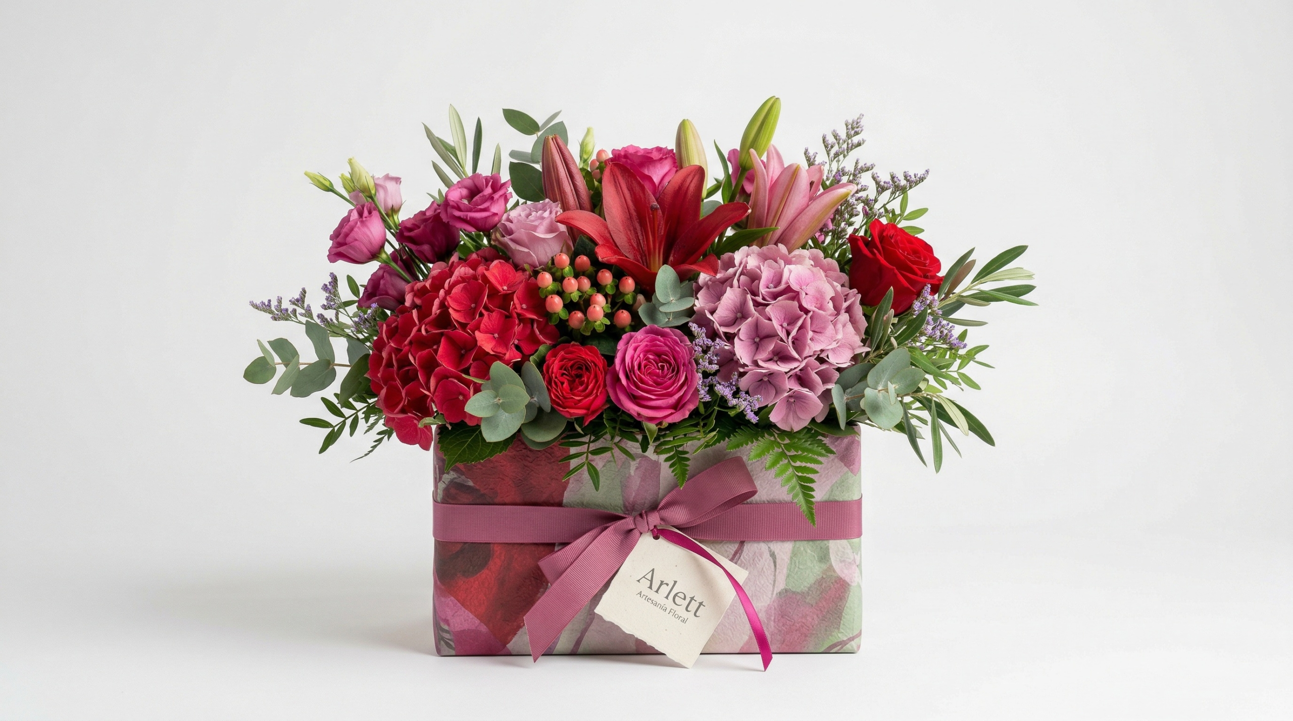 El centro de flores en caja rojo elegante es una propuesta floral sofisticada y actual, diseñada para sorprender con un estilo moderno y lleno de personalidad. Su combinación de tonos rojos y rosados transmite emoción, pasión y elegancia en cada detalle.