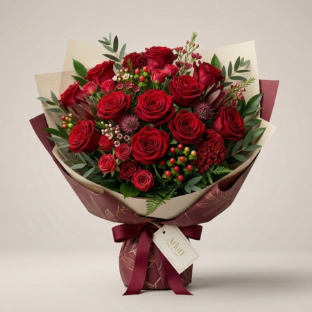 Nada habla tanto de amor como un ramo de 12 rosas rojas de tallo largo, elaborado en una caja de madera con verdes variados y un elegante acabado romántico.