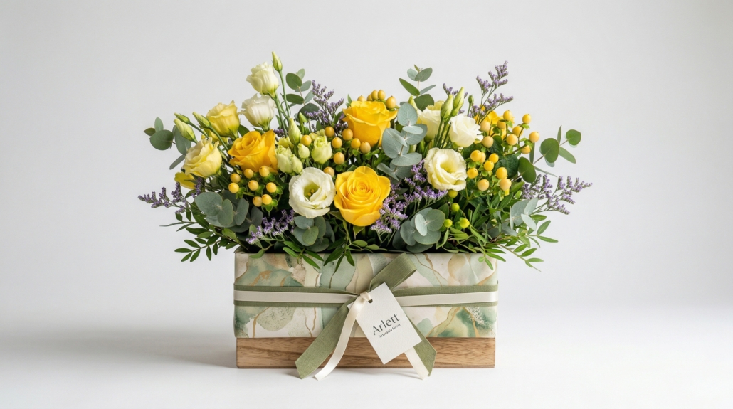 Este centro floral amarillo es ideal para regalar en cumpleaños, agradecimientos o para sorprender con un detalle lleno de luz. Su formato en caja lo hace práctico y moderno, ya que no necesita jarrón y mantiene una presentación impecable desde el primer momento.