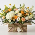 La composición destaca por la mezcla de tonos crema, melocotón, amarillo y verde, creando un equilibrio perfecto entre calidez y naturalidad. Incluye rosas, hortensias, flores de temporada y verdes decorativos que aportan volumen y textura, logrando un diseño visualmente atractivo y lleno de vida.