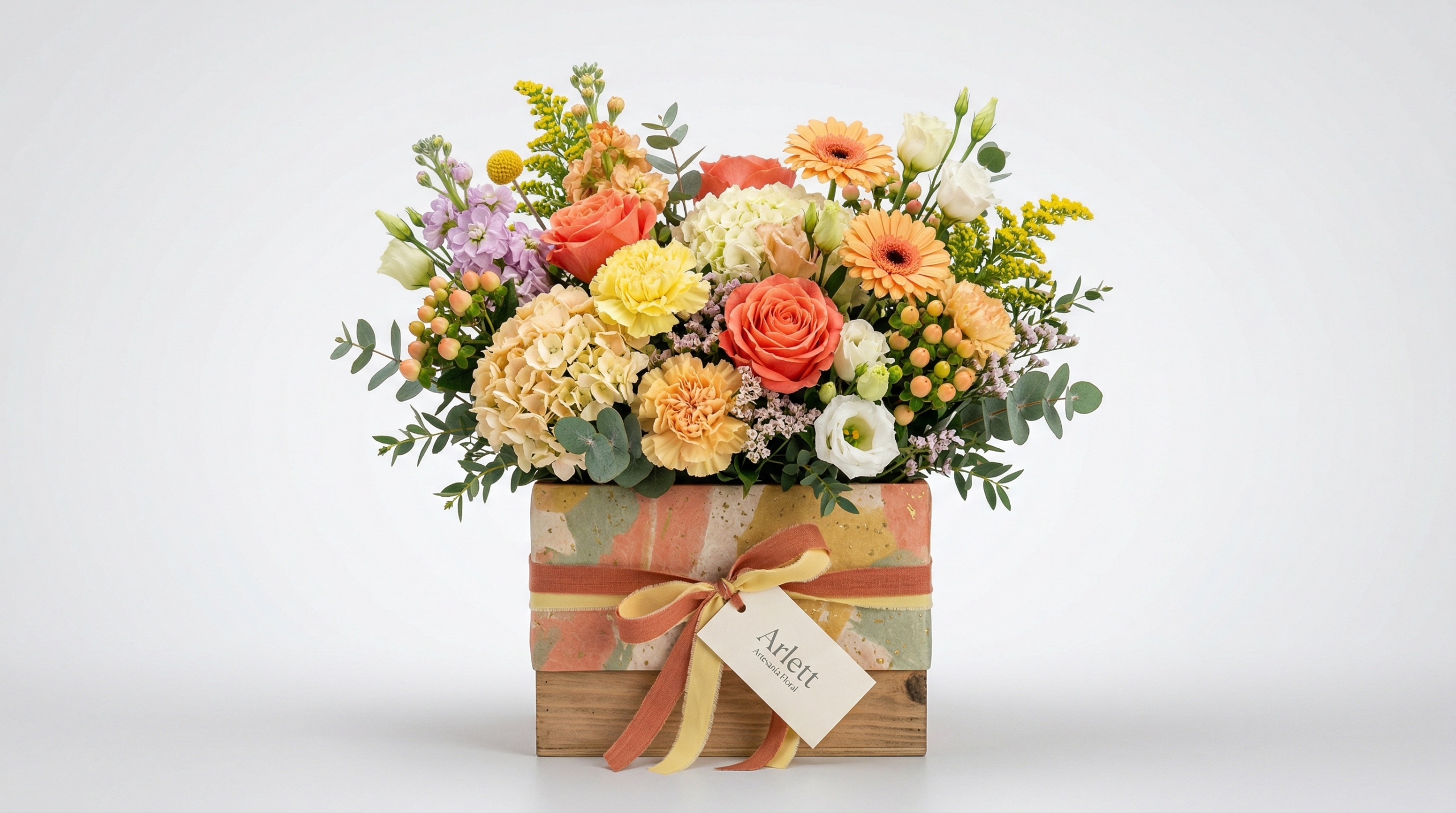Este centro floral en caja cálido está elaborado con rosas, hortensias y flores de temporada cuidadosamente seleccionadas. La combinación de colores en melocotón, amarillo y crema aporta luminosidad y un estilo delicado, perfecto para cualquier ocasión especial.