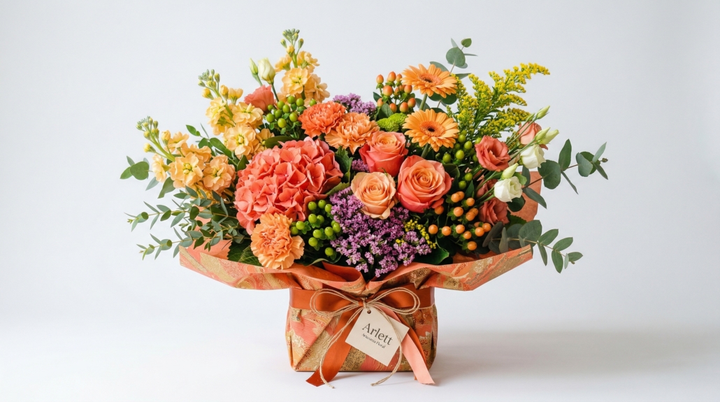 Cada flor se dispone cuidadosamente para resaltar su belleza natural y lograr una composición dinámica, donde los tonos cálidos aportan cercanía y positividad.
