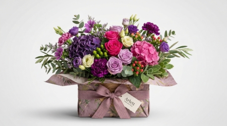 El centro de flores en caja en tonos violetas es una composición floral elegante y sofisticada, diseñada para transmitir delicadeza, estilo y personalidad. La combinación de colores morados y rosados crea un equilibrio armonioso que aporta un toque refinado y moderno.