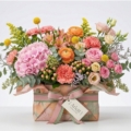 La cesta de flores elegante tonos cálidos es una composición floral que destaca por su equilibrio, suavidad y sofisticación. La combinación de tonos rosados, melocotón y verdes naturales crea un conjunto armonioso y lleno de estilo.