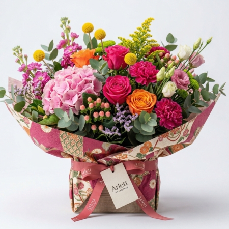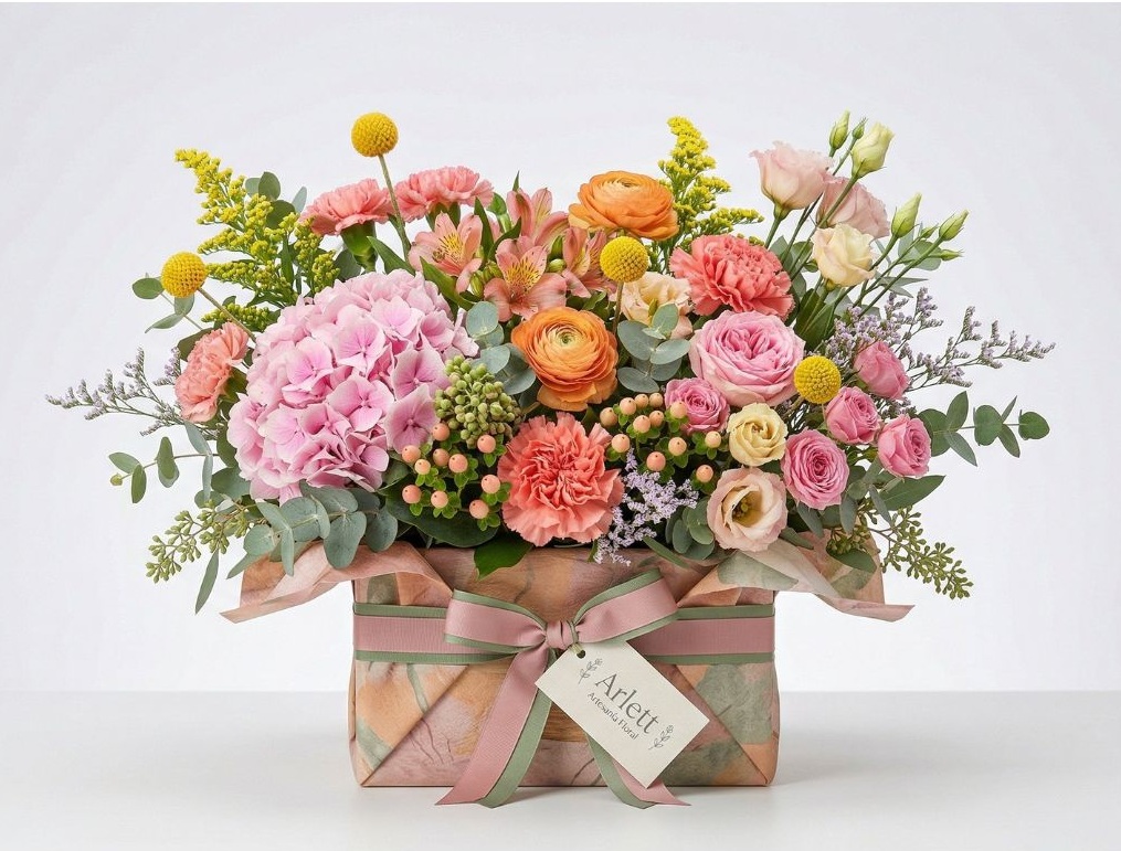 Esta cesta de flores elegante está elaborada con rosas, hortensias y flores de temporada cuidadosamente seleccionadas. Los colores cálidos aportan cercanía y delicadeza, convirtiéndola en una opción ideal para sorprender con un detalle refinado.