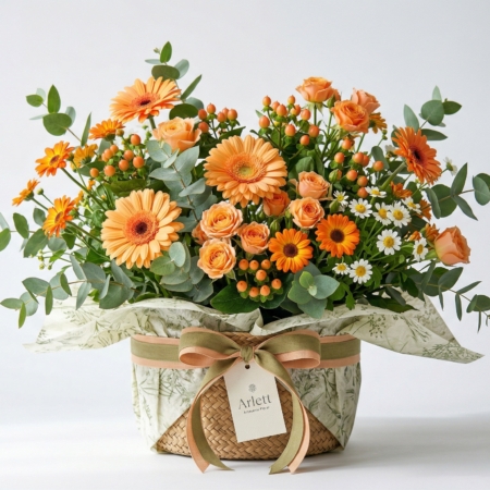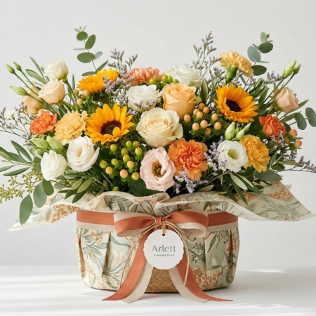 El diseño en cesta aporta un aire acogedor y sofisticado, mientras que los verdes decorativos añaden frescura y volumen a la composición. Cada flor está colocada con precisión para lograr un equilibrio visual armonioso.