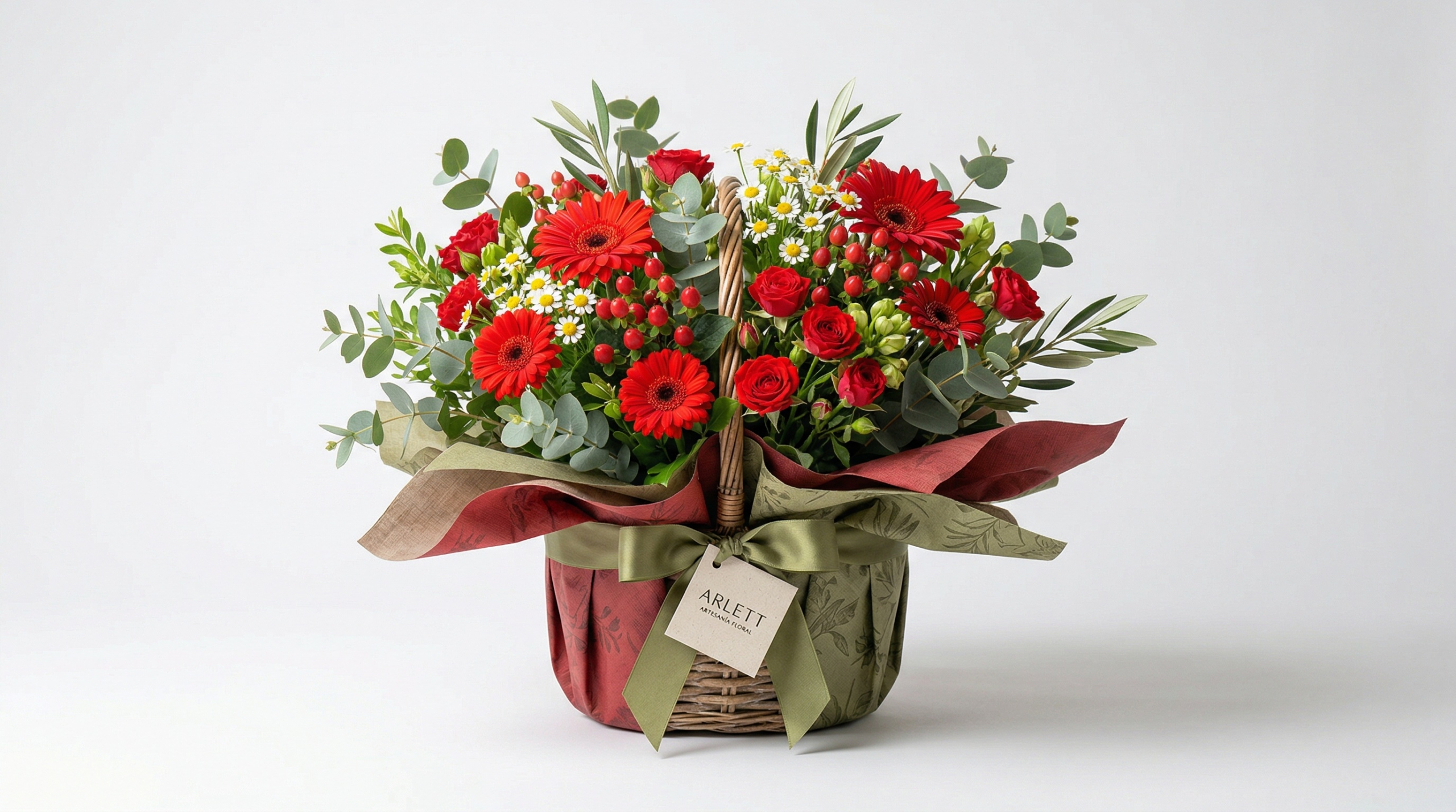 Esta cesta combina gerberas, rosas rojas y flores silvestres con verdes naturales que aportan equilibrio y frescura. Creamos cada composición con cuidado para lograr un diseño armonioso, atractivo y lleno de vida.