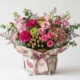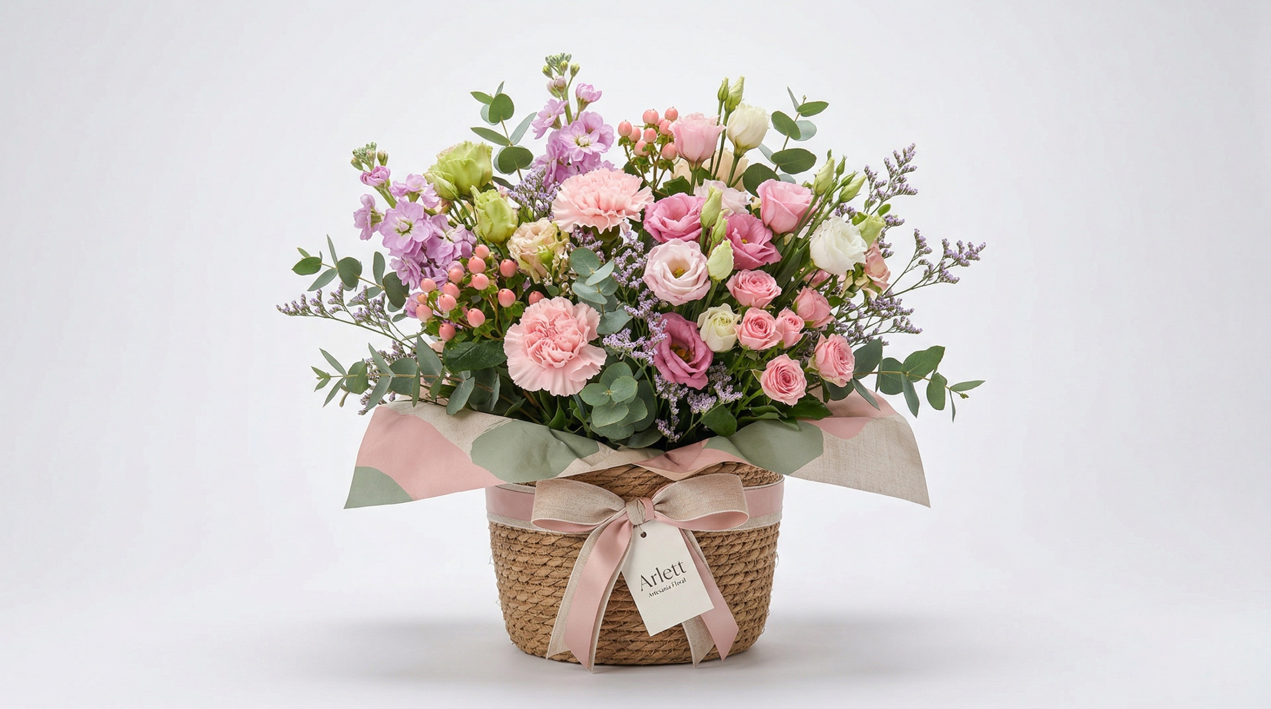 Esta cesta de flores rosa pastel combina rosas, claveles, lisianthus y flores de temporada, creando un conjunto equilibrado y lleno de armonía. La paleta en tonos pastel aporta luminosidad y una sensación de serenidad que la convierte en un detalle muy especial.