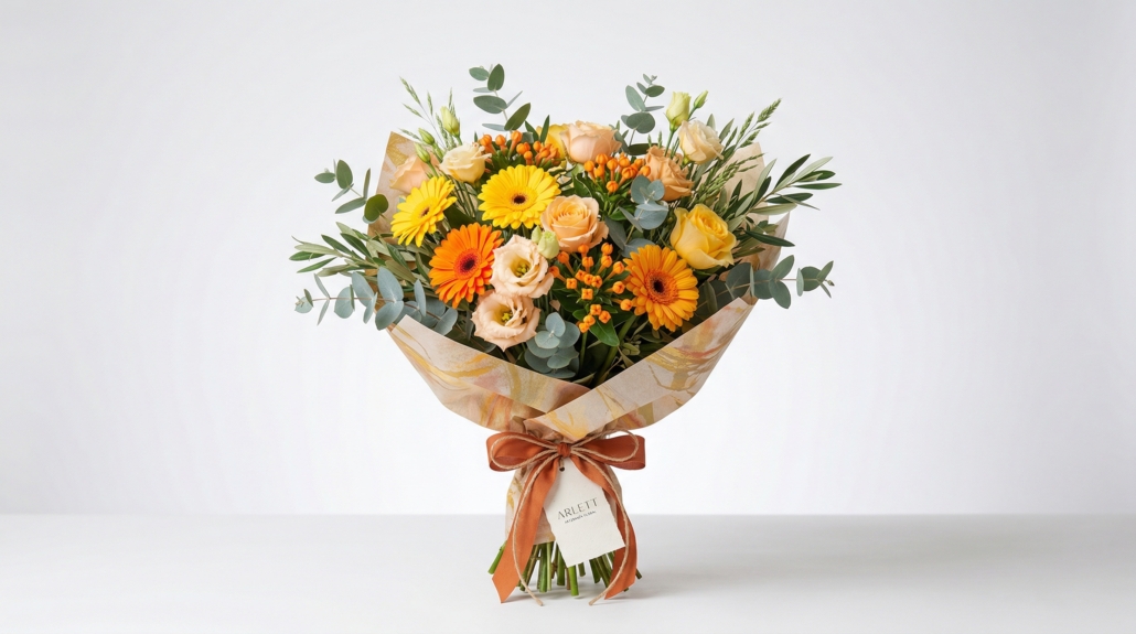 Este ramo de flores amarillo y naranja combina gerberas, rosas en tonos suaves y verdes naturales. Seleccionamos cada flor con cuidado para lograr un diseño equilibrado, elegante y natural.