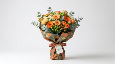 Los tonos naranjas transmiten optimismo, cercanía y energía positiva. Este tipo de ramo es muy versátil y siempre encaja como regalo.