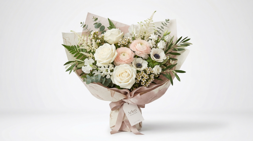 Este ramo combina rosas blancas, flores en tonos empolvados y verdes naturales que aportan frescura. Cada elemento está cuidadosamente seleccionado para lograr una composición equilibrada, ligera y muy elegante.